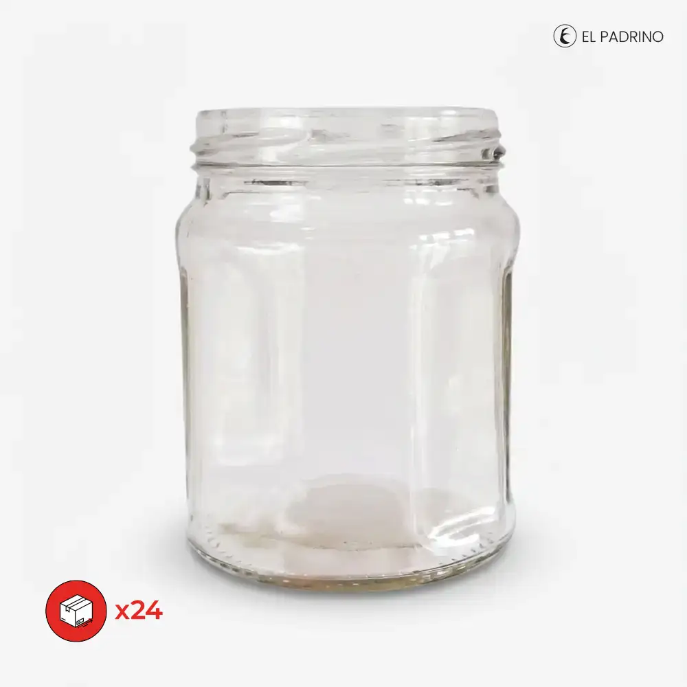FRASCO OCTOGONAL 300 de vidrio ideal para conservas y bebidas. Calidad para uso alimentario.